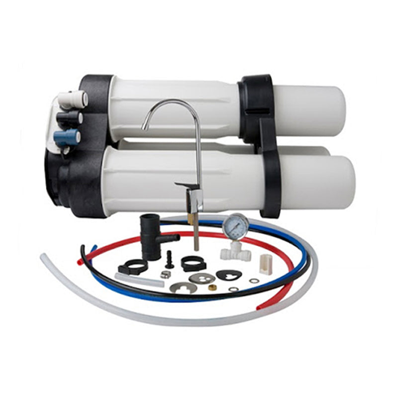 The PRF-RO Reverse Osmosis system is an integrated water treatment system with on-demand, continuous flow that does not require a storage tank operates without the requirement for a pump or electricity. This PRF-RO system features a consistent membrane efficiency and a high recovery. Moreover, it has a high impact plastic construction and compact and sleek styling.
